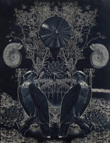 Au contact de l’œuvre de Cynthia Dinan-Mitchell, nous sommes appelés à revisiter des pans de l’histoire de l’art, à repenser des styles, des genres et des techniques a priori inconciliables. Par sa démarche syncrétique, l’artiste rassemble plusieurs influences et procédés : le baroque, la nature morte hollandaise du XVIIe siècle, le clair-obscur, la ligne contour, l’estampe, l’esthétique des films japonais et western, la sérigraphie, la céramique, la sculpture ainsi que des éléments nouveaux dans sa démarche, soit le surréalisme et la botanique. Avec audace, elle brouille les pistes, confond les époques, crée volontairement des anachronismes et provoque des rencontres impossibles entre des objets hétéroclites.