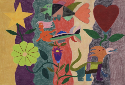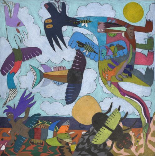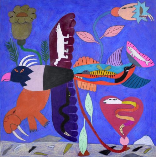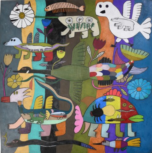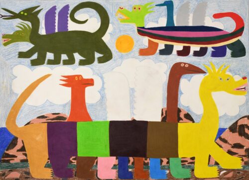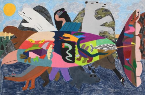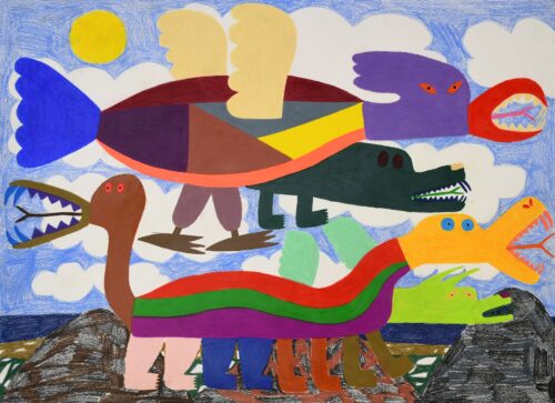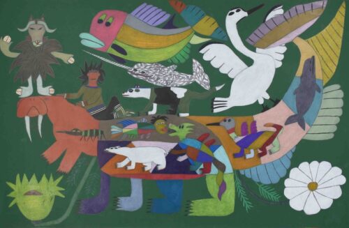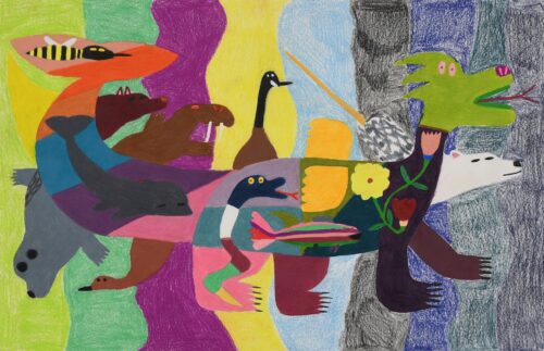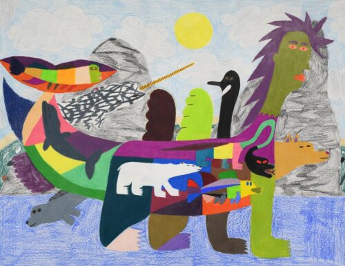 À travers ses dessins, Qimirpik propose une vision sublimée des paysages nordiques de la toundra canadienne, qu’il illustre au crayon de couleur dans des teintes vibrantes. Ses compositions foisonnantes sont peuplées de créatures hybrides et fantastiques, parfois grotesques, évoluant au cœur des vastes étendues du Grand Nord et des eaux glacées de l’Arctique. Inspirés de la mythologie inuite, ces êtres cohabitent avec la faune locale, incluant bélugas, morses, loups arctiques, bœufs musqués et ours polaires. Ne recourant pas aux techniques de perspective, Qimirpik organise ses compositions par une superposition dynamique de formes et de couleurs, disposant tous les éléments sur un même plan.