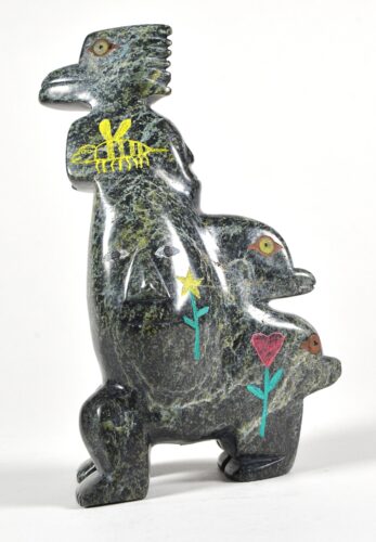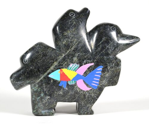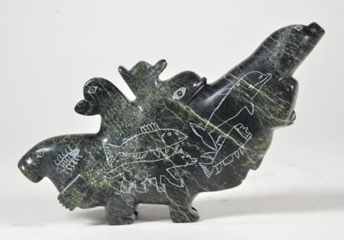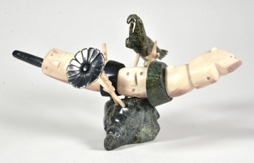 La plupart de ses dessins et sculptures explorent le concept de transformation chamanique, une croyance spirituelle selon laquelle certains individus peuvent, en cas de nécessité, revêtir la forme d’un animal afin de bénéficier de ses attributs spécifiques et survivre dans les conditions extrêmes de l’Arctique. À travers ses créations, Qimirpik réinterprète les mythes, récits et légendes transmis par les aînés, en y insufflant une énergie contemporaine. Ses sculptures ludiques et surprenantes, élaborées par assemblage, mettent en scène des figures humaines, mythologiques et animales, fusionnées, imbriquées ou superposées. Elles illustrent un principe central de la spiritualité inuite: l’interconnexion du vivant.