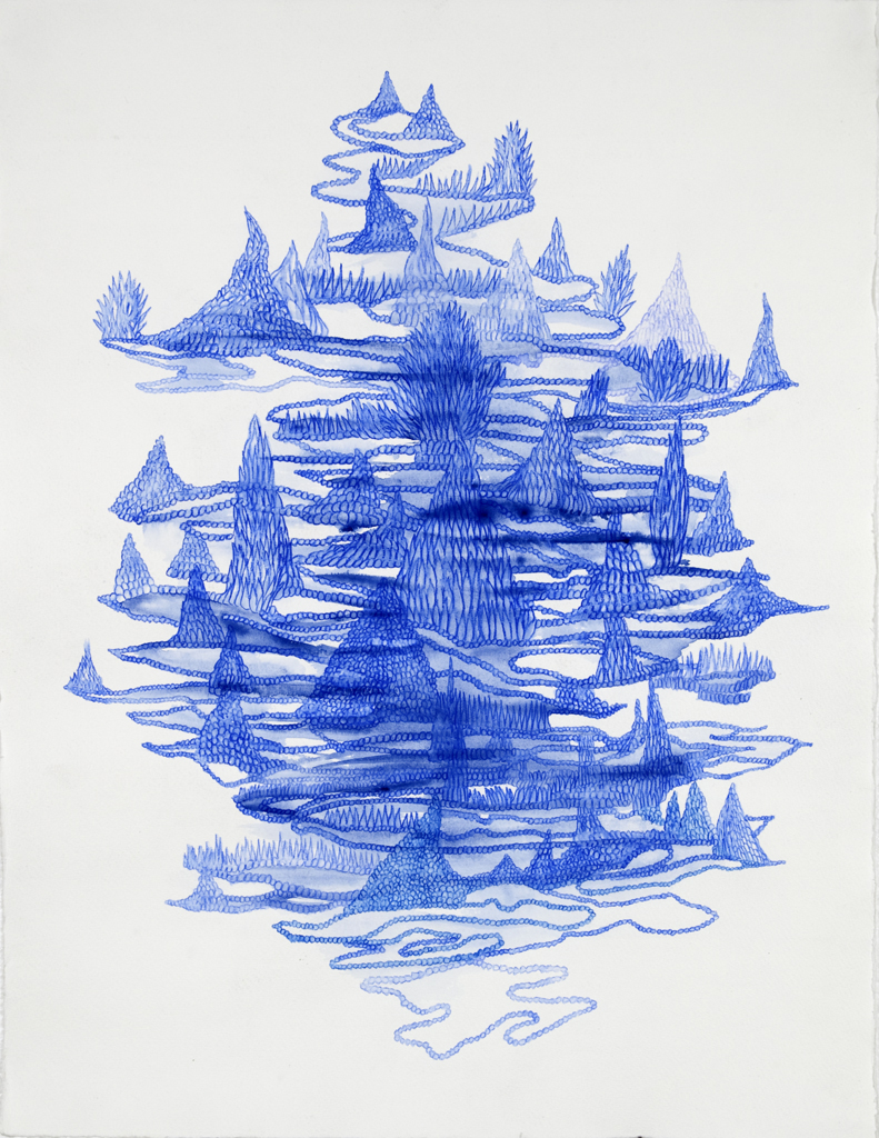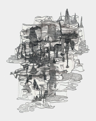 In her artistic practice, Catherine Bolduc takes an interest in the way the psyche interprets the real by projecting its desires on it, and by transgressing it through idealization and fantasizing. The outside world is here viewed as a subjective mental construction in which memory, whether individual or collective, influences perception and where fiction and reality merge. Drawing both on the autobiographical and autofictional, Bolduc’s explorations share elements of the travel story or childhood recollections as well as of dreamscapes or hypnotic wanderings. Presented as large-scale installations or as interventions on paper, these works alternate between the domestic and the cosmic, the sublime and the apocalyptic, in which magic shows another reverse side. By way of her themes, the motifs and materials used (decorative, kitsch, cosmetic), and a self-assumed reclaiming of affect (emotion and the romanticism), Bolduc takes a feminist stance in her practice.