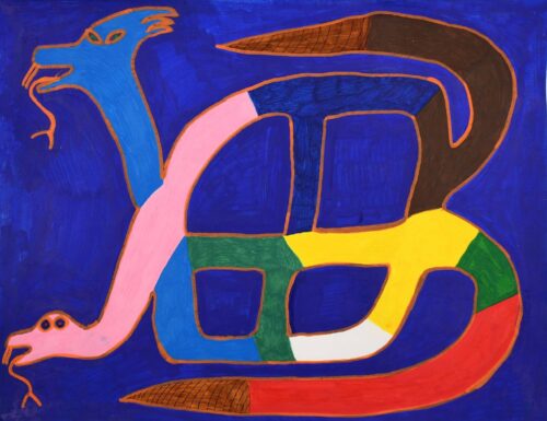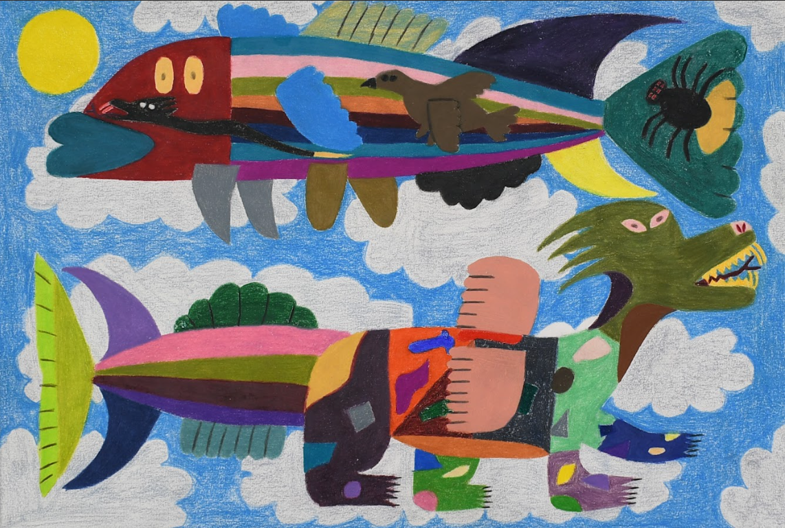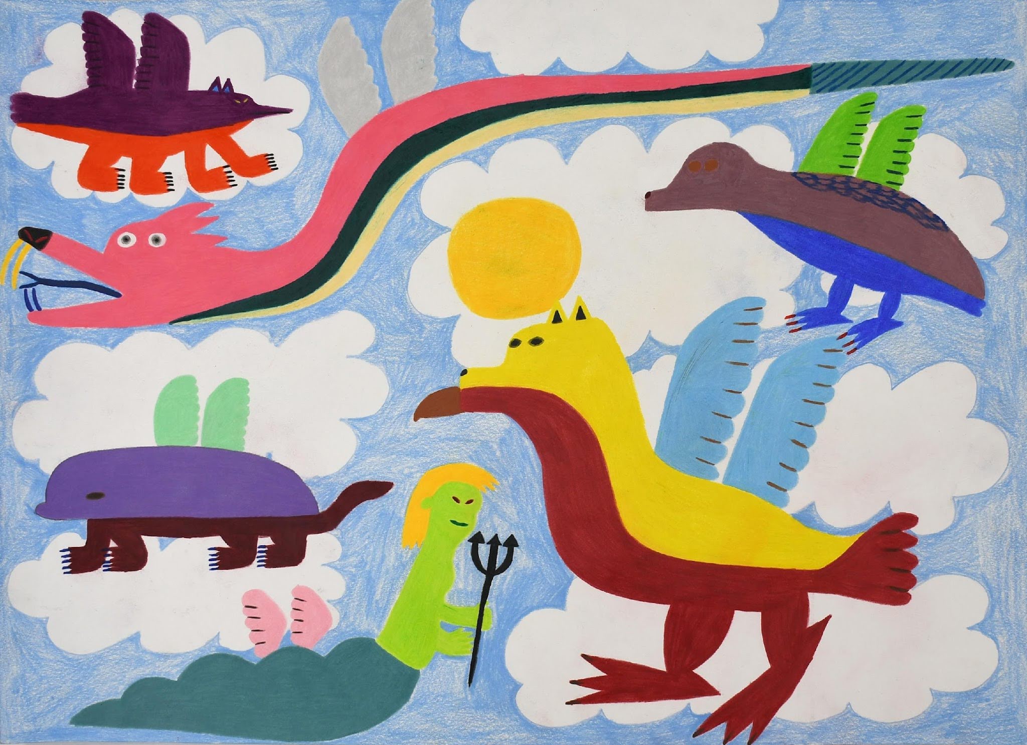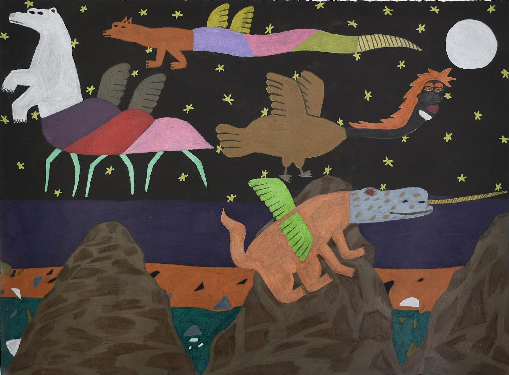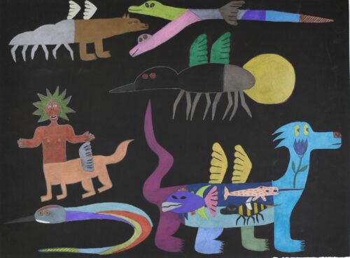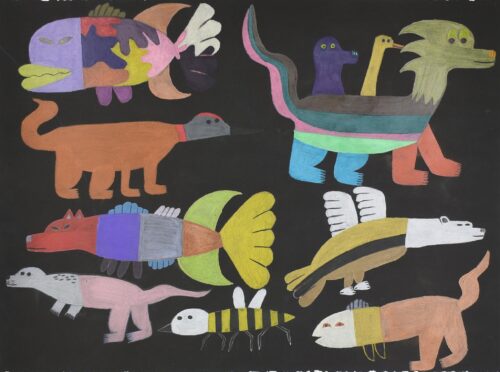Through his drawings, Qimirpik presents an enhanced vision of the northern landscapes of the Canadian tundra, which he illustrates with colored pencils in vibrant hues. His intricate compositions are populated by hybrid and fantastical creatures, sometimes grotesque, evolving amidst the vast expanses of the Far North and the icy waters of the Arctic. Inspired by Inuit mythology, these beings coexist with the local wildlife, including belugas, walruses, Arctic wolves, musk oxen, and polar bears. Without using traditional perspective techniques, Qimirpik structures his compositions through a dynamic layering of shapes and colors, arranging all elements on a single plane.