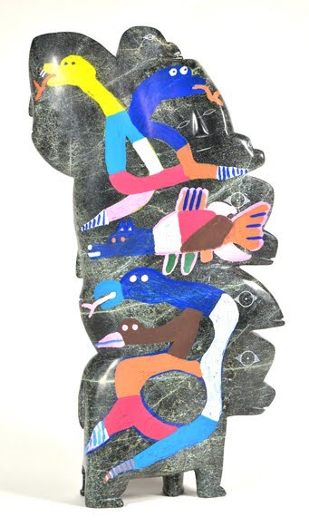 Aged 38 and based in Kinngait, Nunavut, Pitseolak Qimirpik is at the forefront of a flourishing generation of young Inuit artists. Coming from a lineage of sculptors, he was trained in this art from a young age by his father, Kellypalik Qimirpik, working alongside him as an apprentice. At 13, he created his first sculptures and quickly distinguished himself with his unique style, earning recognition on the Canadian art scene. Fantastical, inventive, and infused with humor, his universe boldly merges Inuit traditions with symbols of North American popular culture.