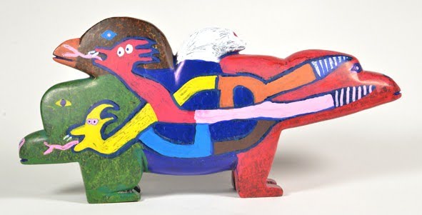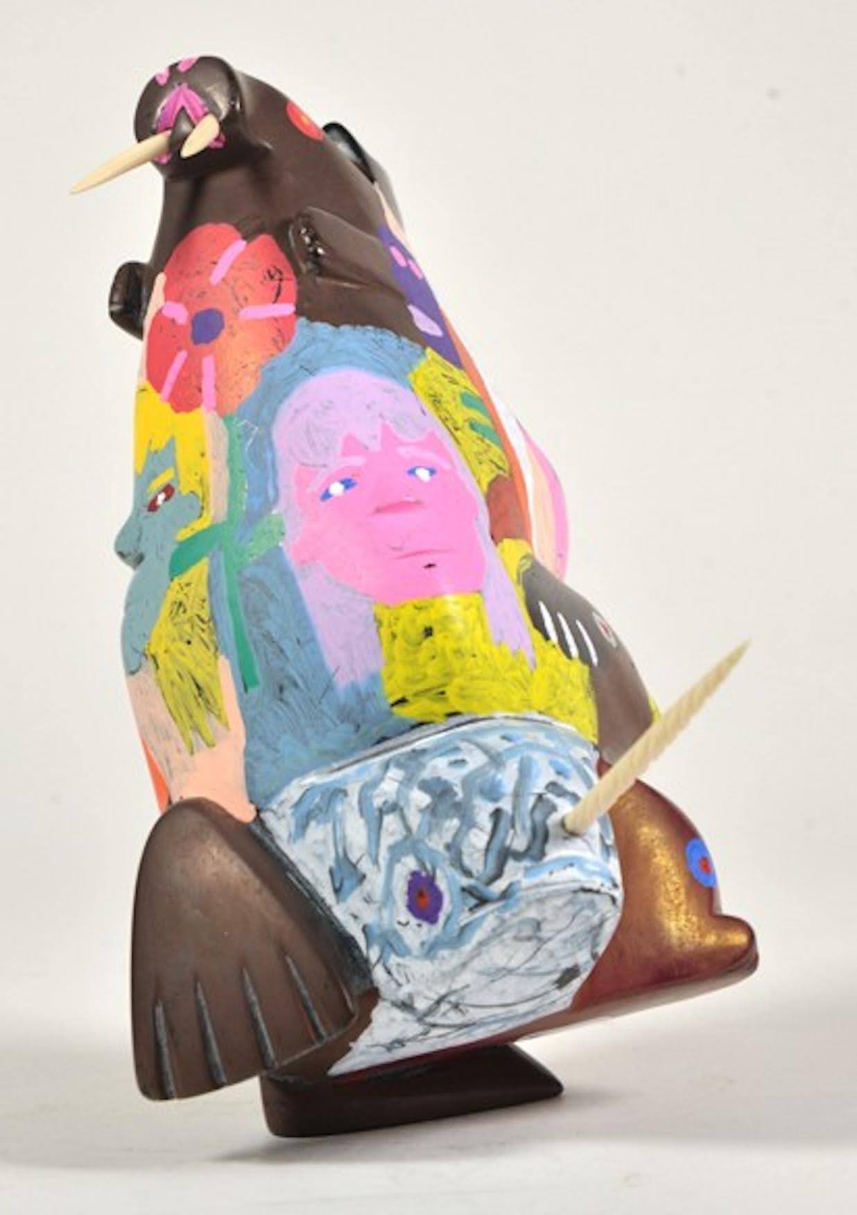 Most of his drawings and sculptures explore the concept of shamanic transformation, a spiritual belief that certain individuals can, when necessary, take on the form of an animal to gain its specific attributes and survive in the extreme conditions of the Arctic. Through his creations, Qimirpik reinterprets myths, stories, and legends passed down by elders, infusing them with contemporary energy. His playful and surprising sculptures, created through assemblage, depict human, mythological, and animal figures that are fused, intertwined, or superimposed. They illustrate a central principle of Inuit spirituality: the interconnectedness of all living things.