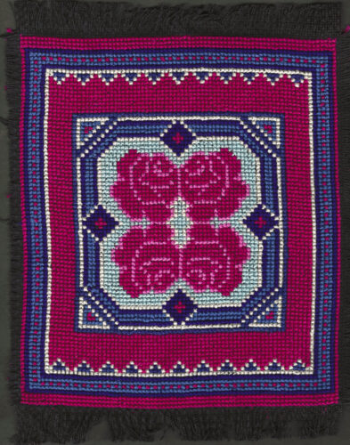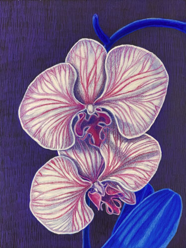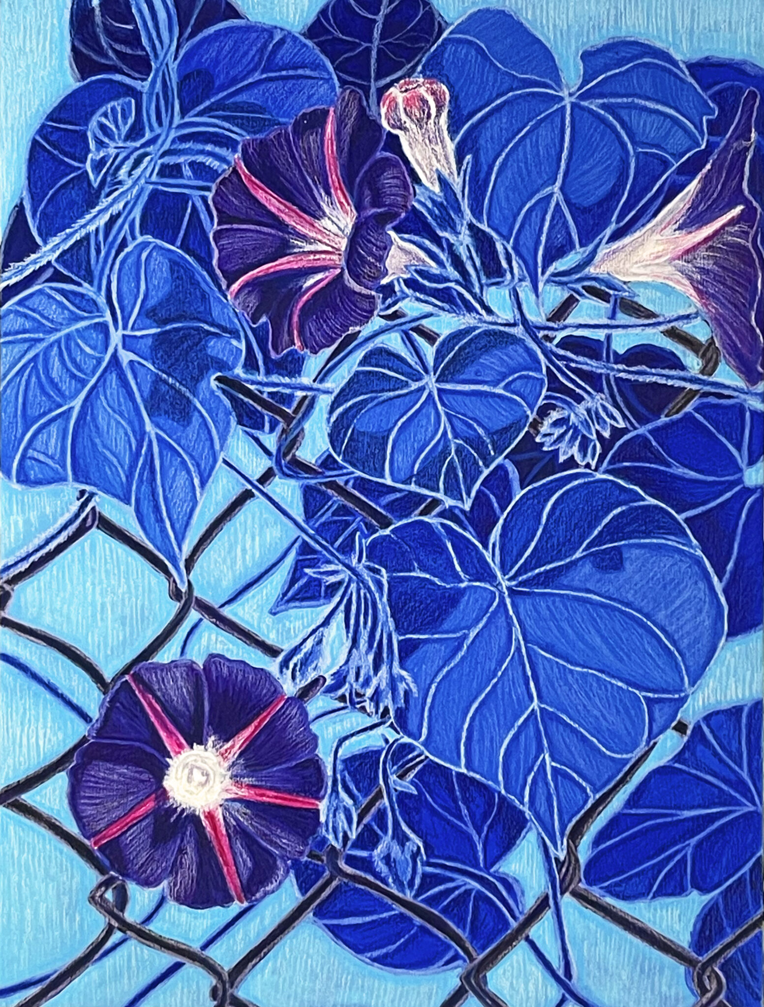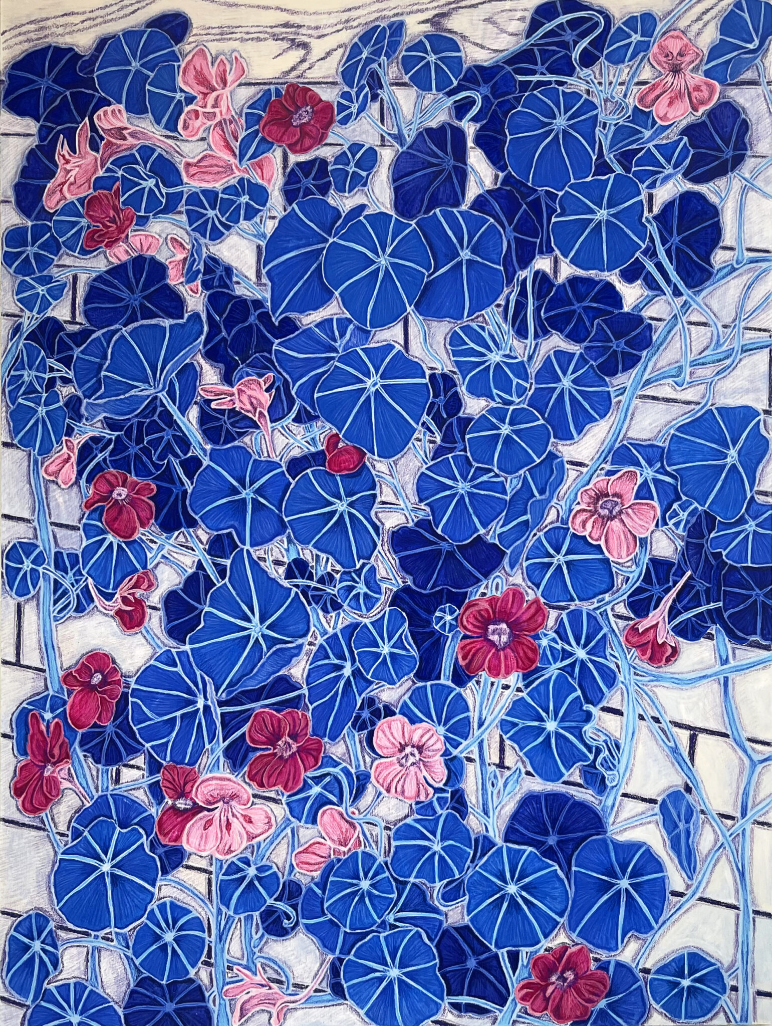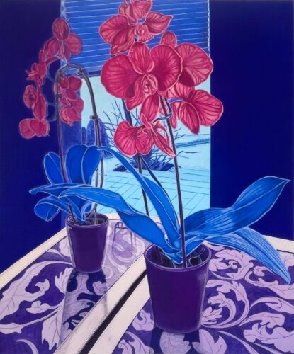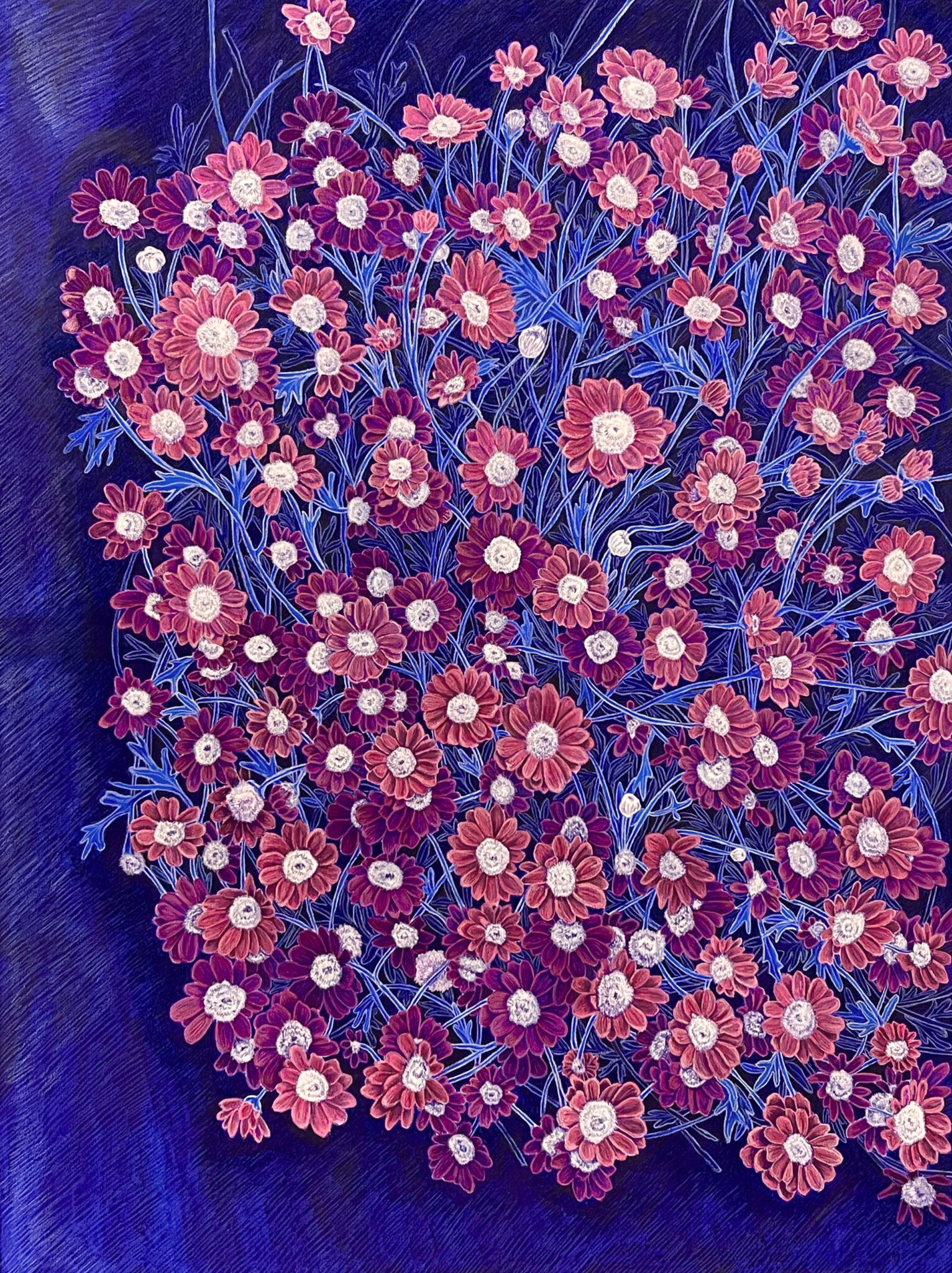 Her practice has evolved from watercolor monotypes to a continuously expanding series of paintings and screen prints. Her palette—magenta, fuchsia, and ecru—is marked by the central presence of blue, which brings a deeply personal and introspective dimension to her work. These colors evoke both authentic and altered memories, serving as a bridge that connects her identity to her heritage.