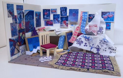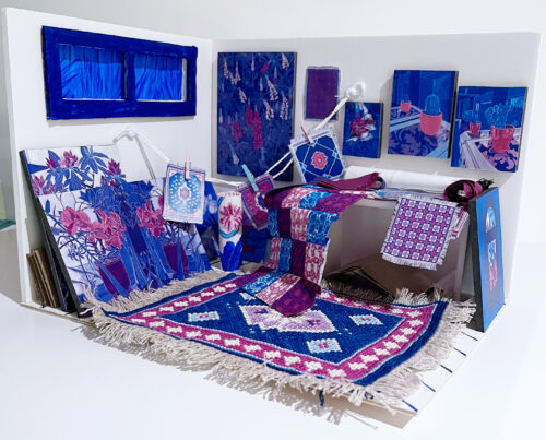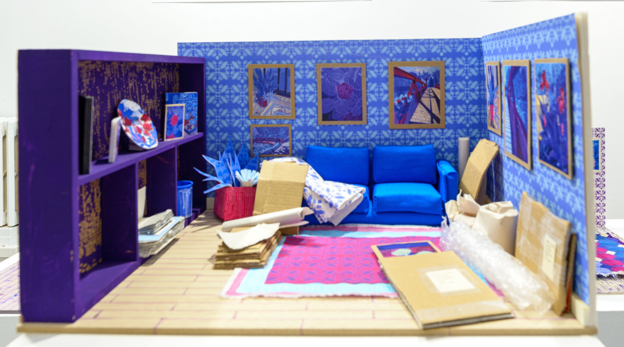 Shazia Ahmad combines painting and printmaking to create microcosms of domestic life, which she materializes as handcrafted dioramas. Her work, oscillating between miniatures and large-scale worlds, illustrates how memories and the passage of time accumulate to form diverse narratives. Through her pieces, she recounts journeys across time and space, paying tribute to the intimate relationships woven along the way.
