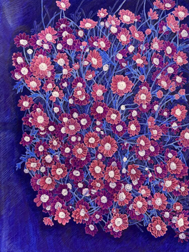As an artist of multiple cultural and religious backgrounds, this hybridity is reflected in her work through a vibrant palette, rich patterns, and themes that construct her universes. Her relationship to identity is both nostalgic and nuanced: she clings to the past even as her memories fade. She expresses these recollections through recurring and reconstructed elements—everyday objects and depictions of flora—created over several days and under varying light.