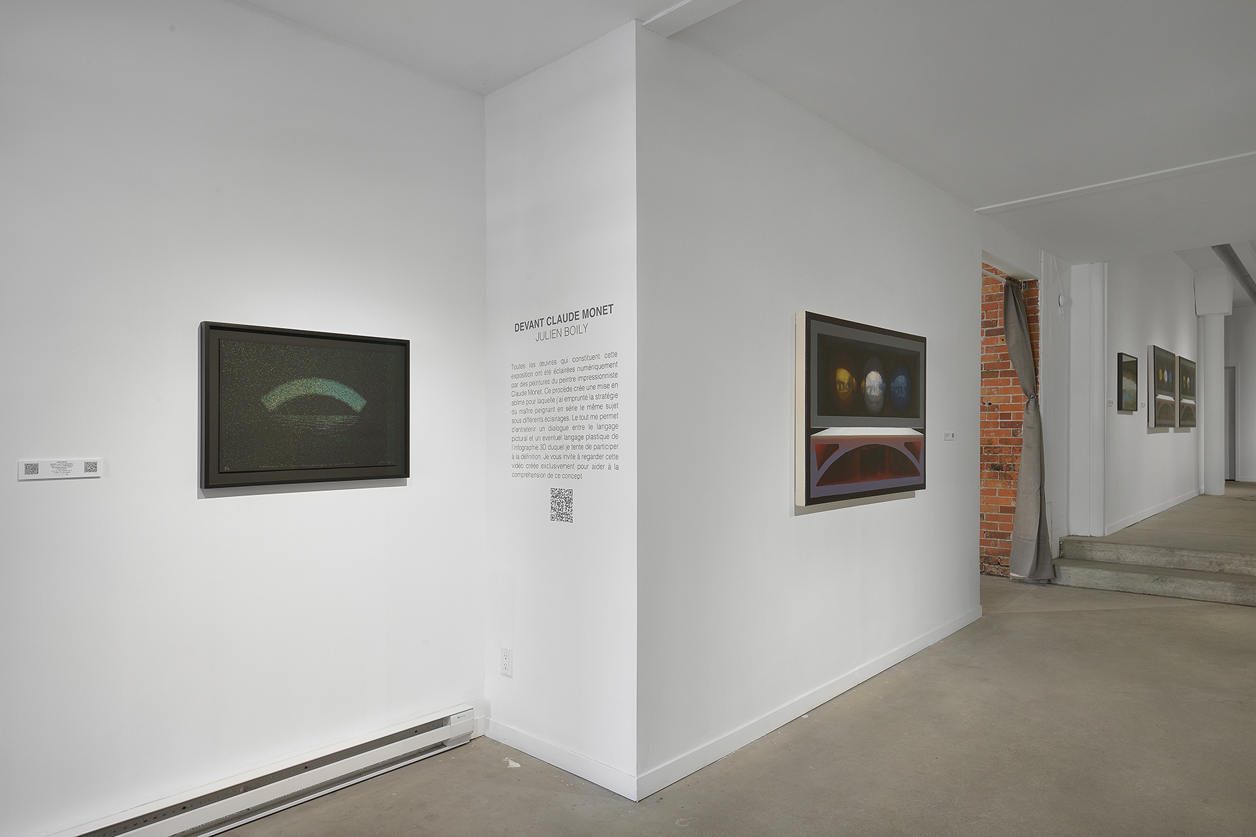 Devant Claude Monet brings together works where the common thread is the representation of virtual scenes, illuminated with paintings by the great master of impressionism: Claude Monet. With 3D computer graphics, Boily has generated compositions in which the light, and consequently, the atmosphere, ambiance and coloring, are shaped by Monet’s paintings placed before them. These images are subsequently rendered into paint or via the silkscreen process. The result is a mise en abyme that maintains a true interdisciplinary dialogue between these different media.