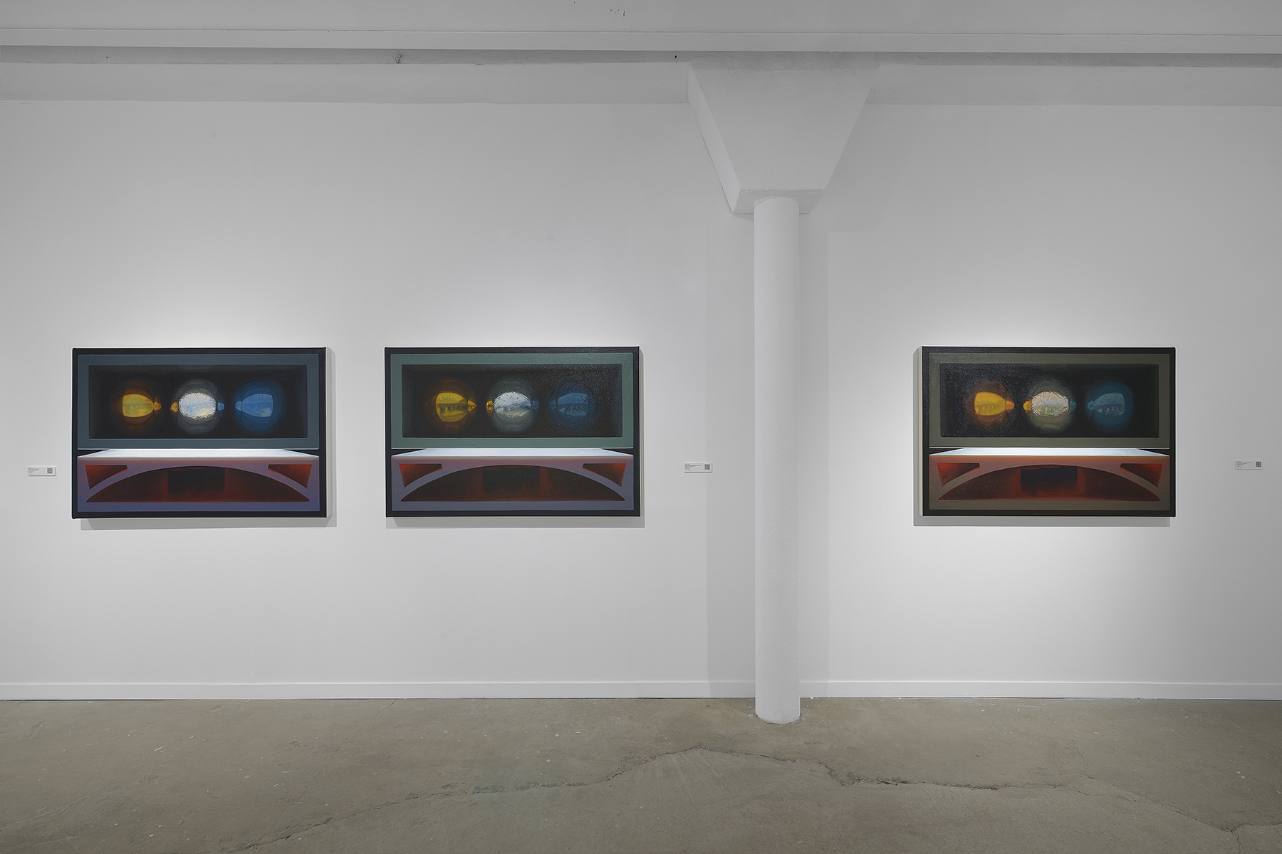 Adopting a conventional pictorial approach, Boily paints still lifes composed of forms generated by 3D computer graphics. Often made of simple primitive geometries, his compositions bring to the forefront the materiality of these objects and the way they interact with the light and the environment that surround them. These properties that are emulated by digital tools today have been at the heart of painters’ artistic preoccupations for centuries, namely the interaction between objects and light, perspective, reflection, refraction and many others.