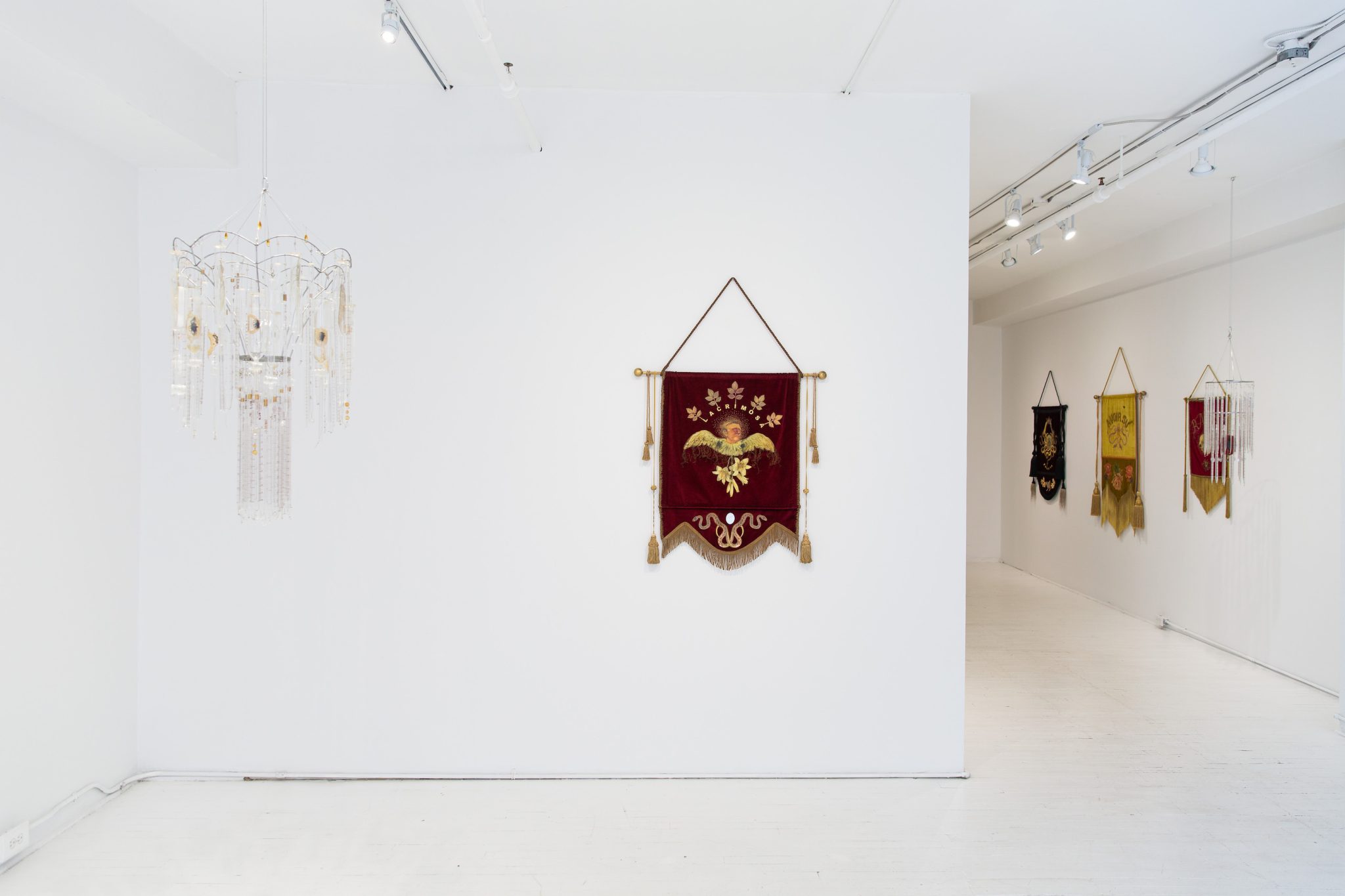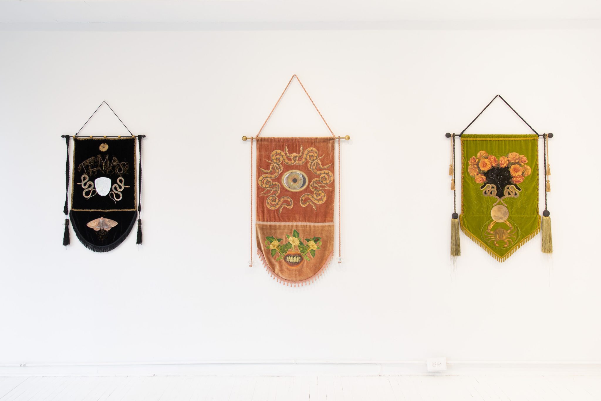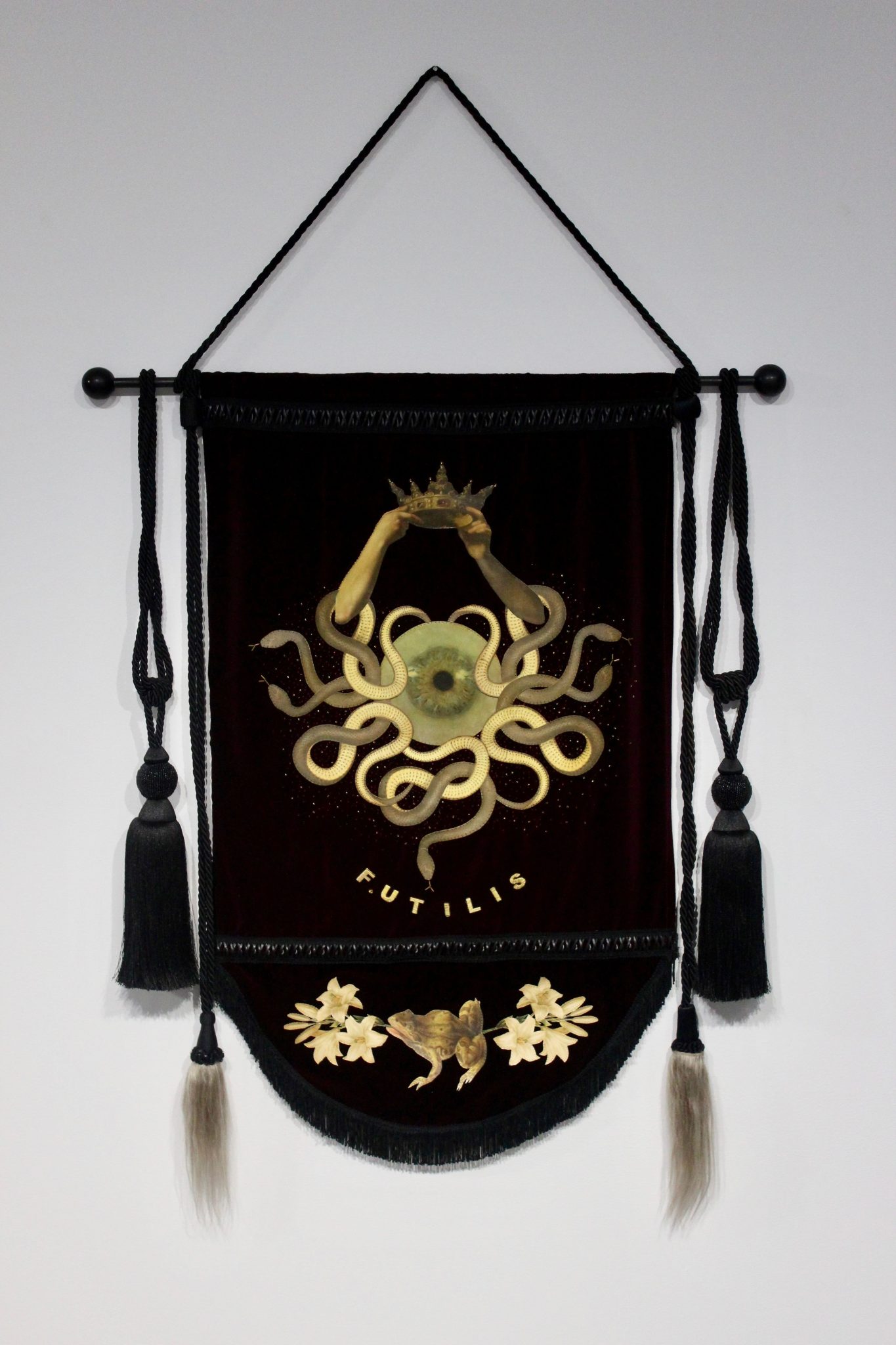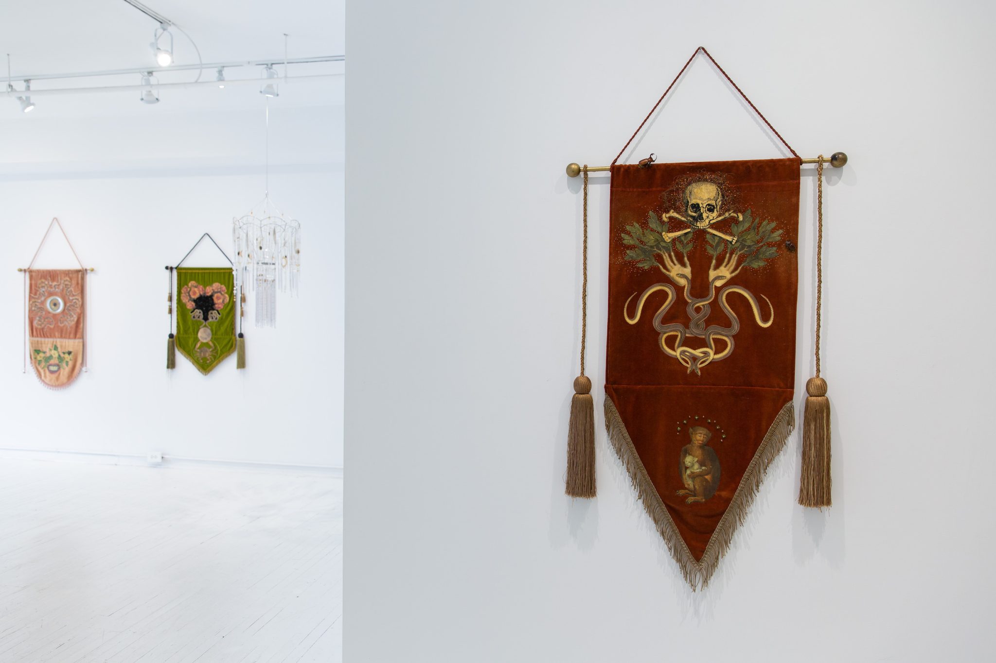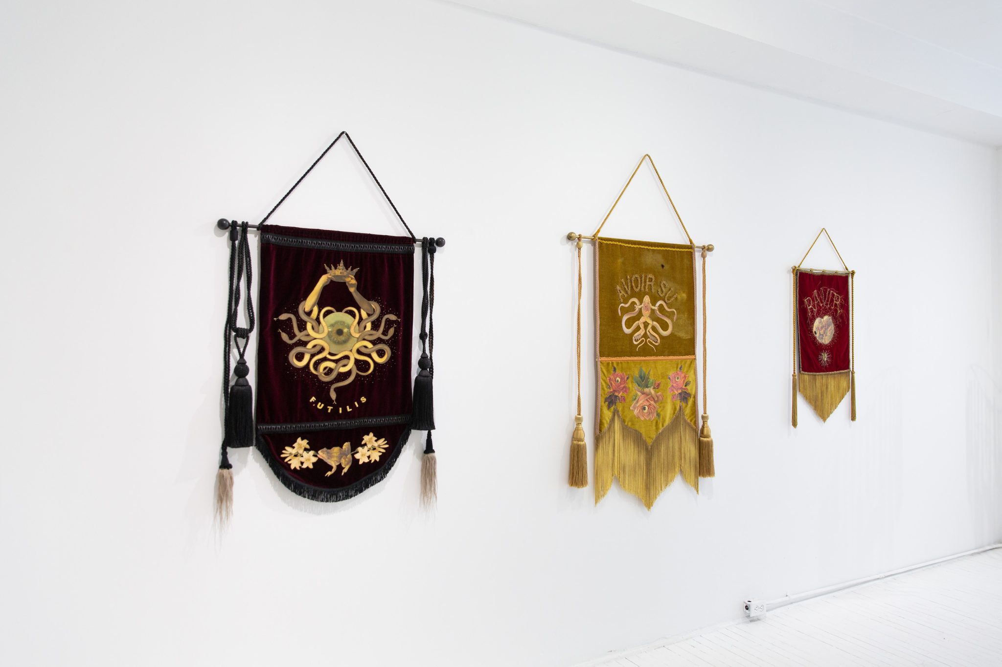Steeped in references to the history of art and harbouring hidden symbolisms, Claudie Gagnon’s works gradually reveal their full density. In F.UTILIS, the artist takes her inspiration from the banners of mortuary processions to revisit the pictorial genre of the vanitas. Rooted in the still-life tradition, the vanitas highlights the fragility of existence through a codified iconography of hidden symbolisms. Insects, snakes, flowers, mirrors and human skulls are all references to the ephemeral and transitory nature of life. Reappropriated by the artist, these symbols evoke the emptiness of our consumerist societies and offer the viewer a meditation on his or her own end.
