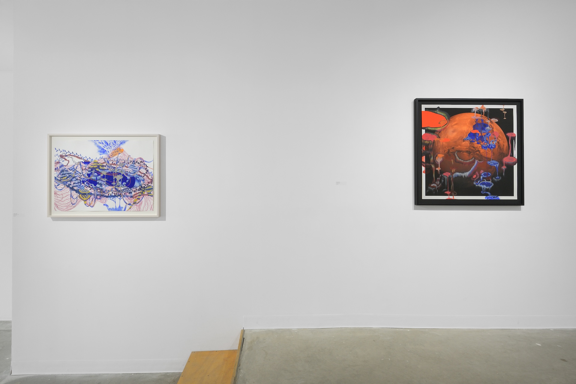 In several works, abundant hair, waterfalls, craters, and labyrinthine structures inspired by the nervous system populate the surface. These gaps, glimmers, and transparencies embody both the dark zones of the psyche and the erased memories of the planet. Textures, patterns, and colors invoke the aesthetics of ornament, blurring the boundaries between cosmology, intimacy, and vanity.