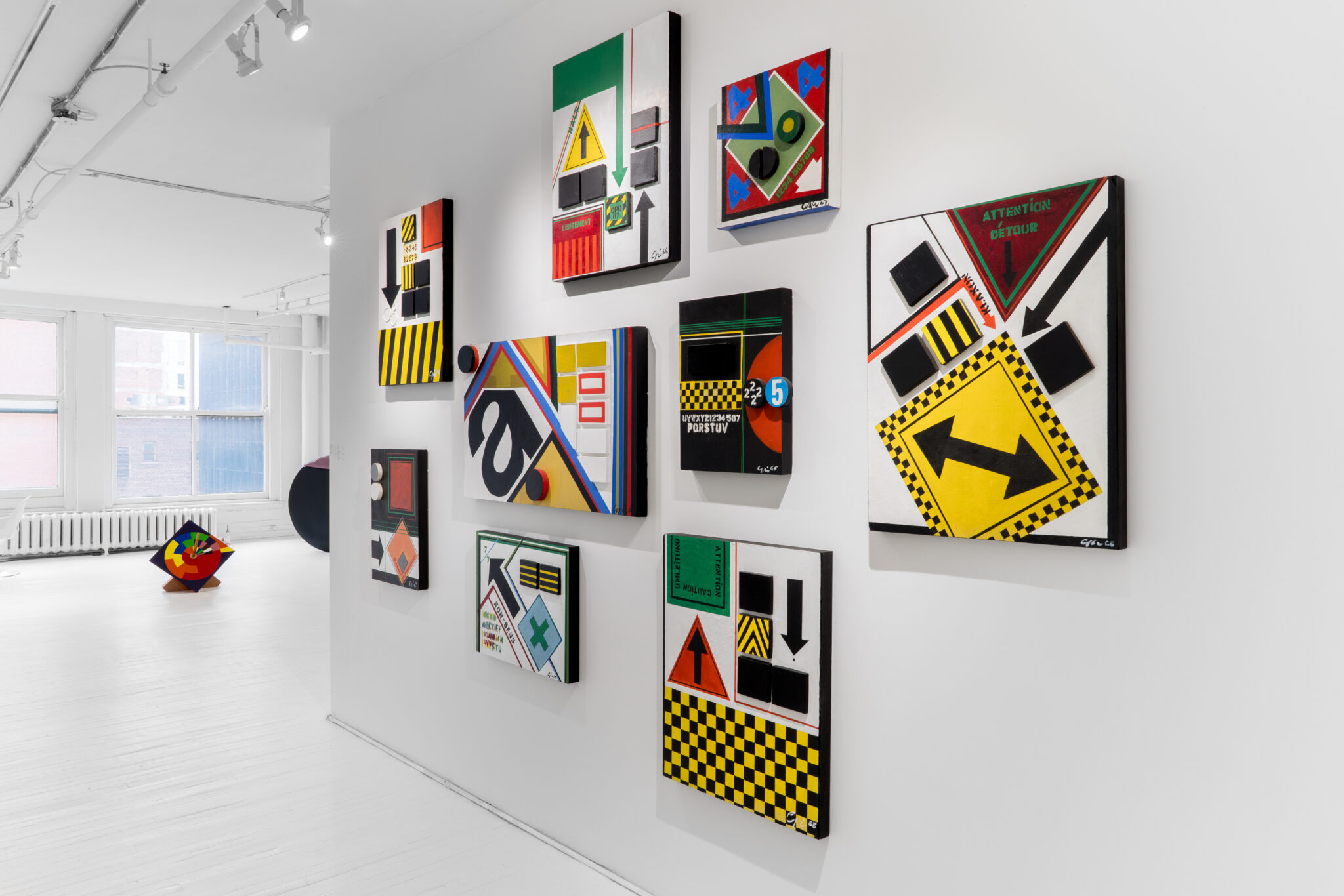 Created in 1966, a year before the duo officially adopted the name Cozic, A-Anathème and Halt— which the artists describe as painting-reliefs—draw inspiration, in a resolutely Pop aesthetic, from the graphic symbols of road and commercial signage. They reveal the couple’s early fascination with signs, symbols, elements of language, and everyday objects. Among the oldest and least-known works by the duo, they had not been shown since 1971.