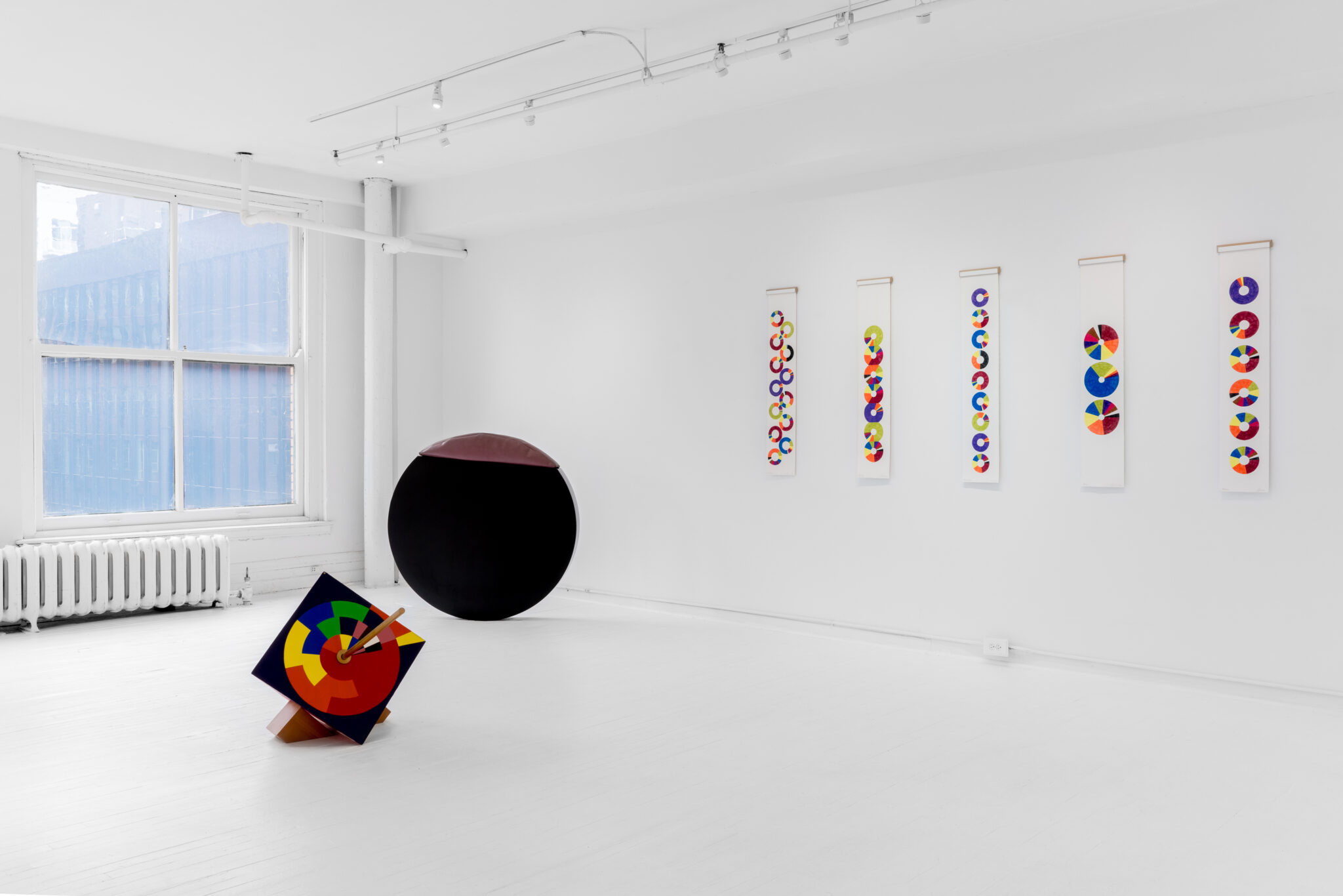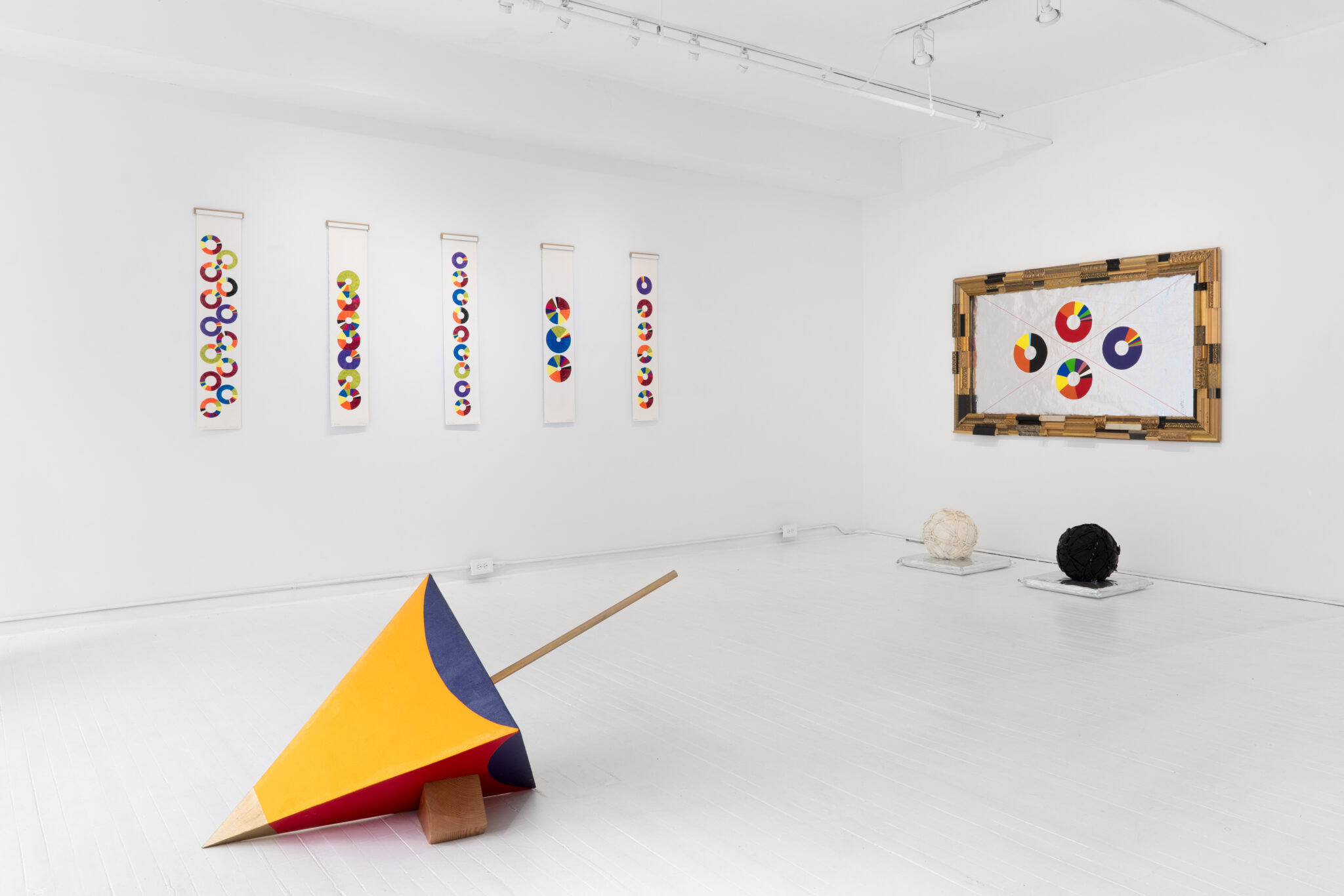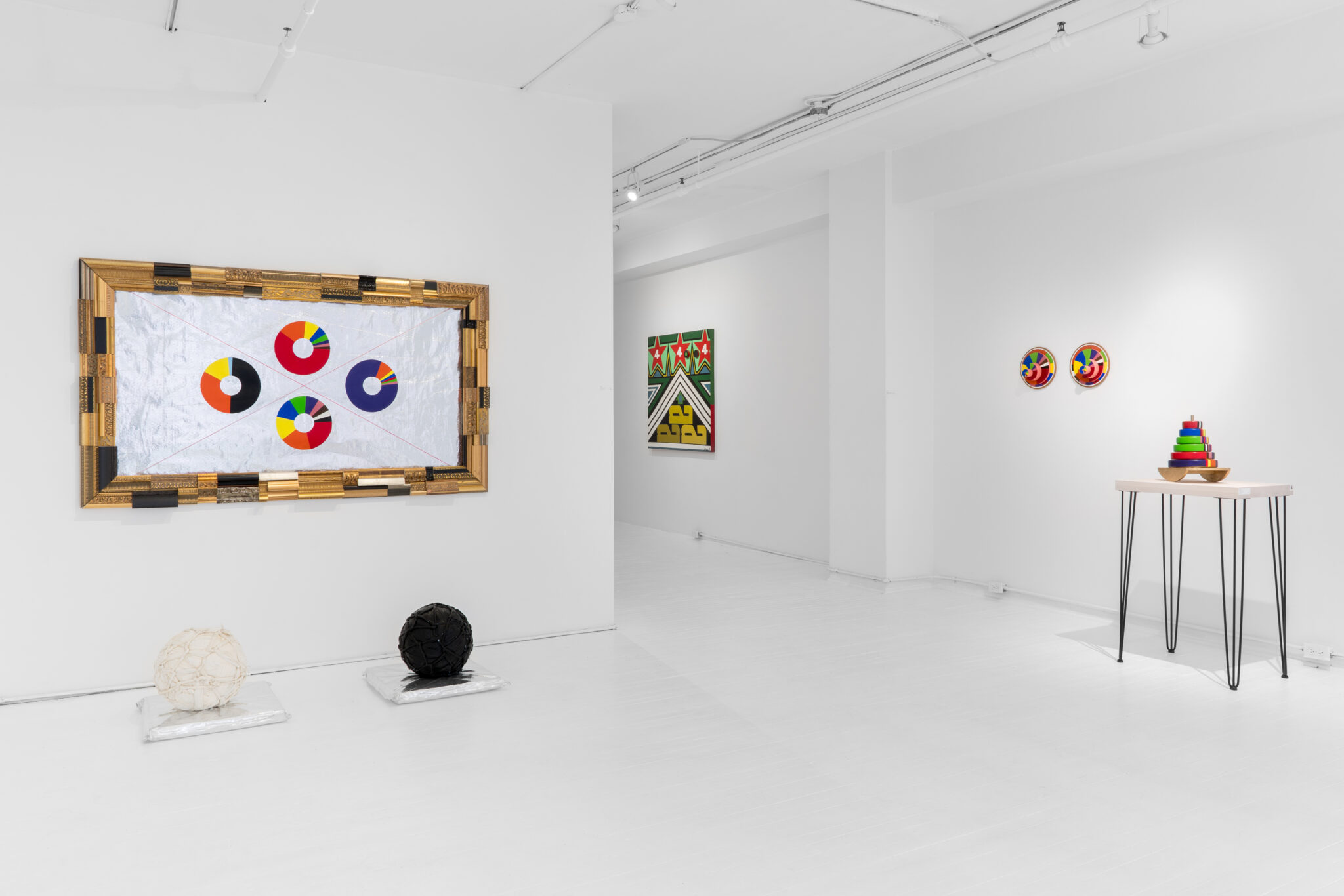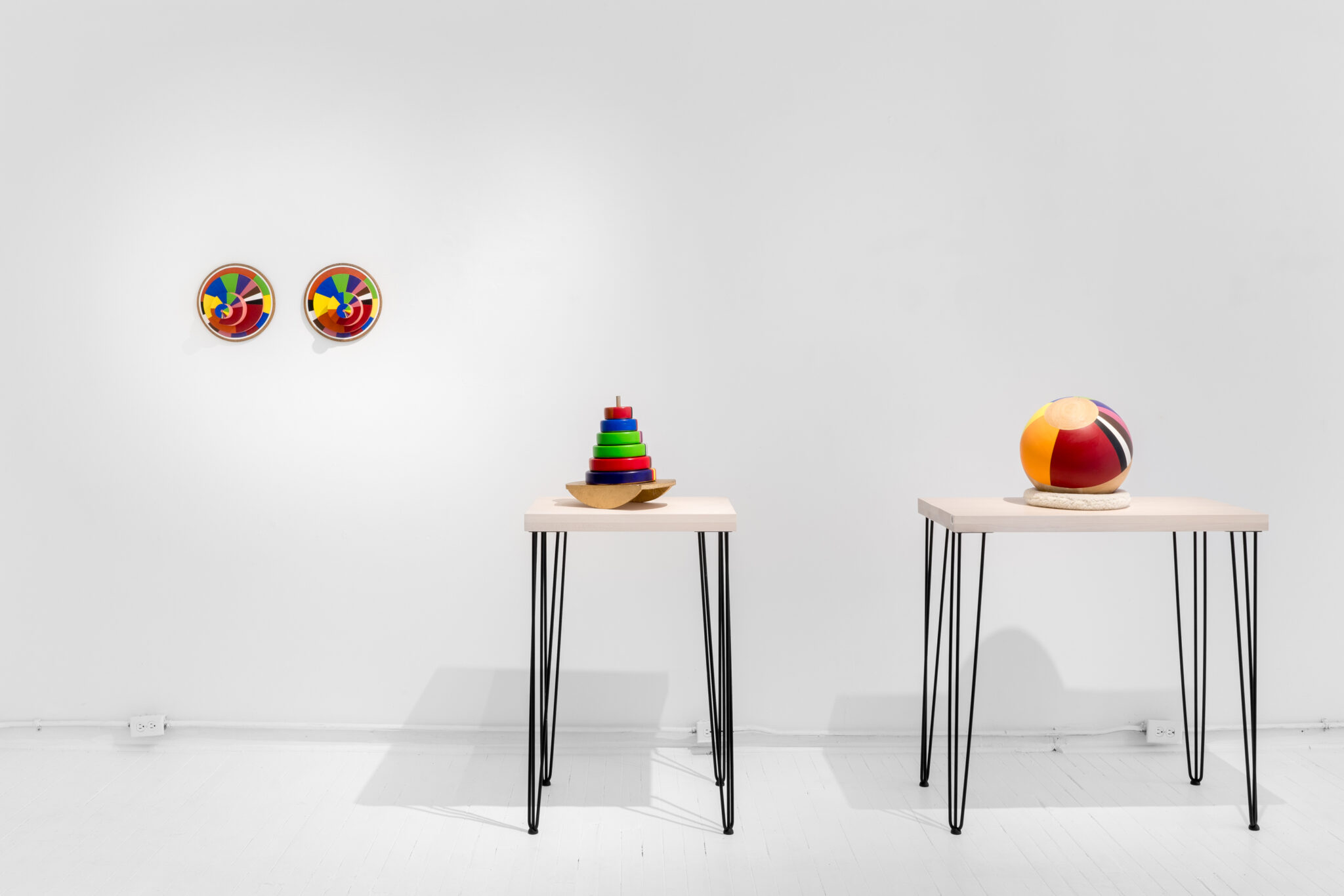 Closely linking art and play, Cozic encouraged the participation of the viewer, invited to decode the Crown Codes integrated into the works using a decoder. Boule E, Dieu, and Rythme, shaped like familiar children’s toys (a ball, a hybrid target combining darts, archery, and a spinning top, as well as a stacking game) embody this playful and participatory dimension of their practice. Like playful riddles, the titles of the works are transposed into the Crown Code and embedded within the objects themselves.