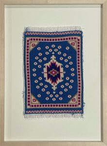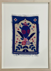 Shazia Ahmad, Carpet Blue, 2024, Cotton embroidery thread on cotton Aida fabric for cross-stitch, 17.78 x 26.67 cm