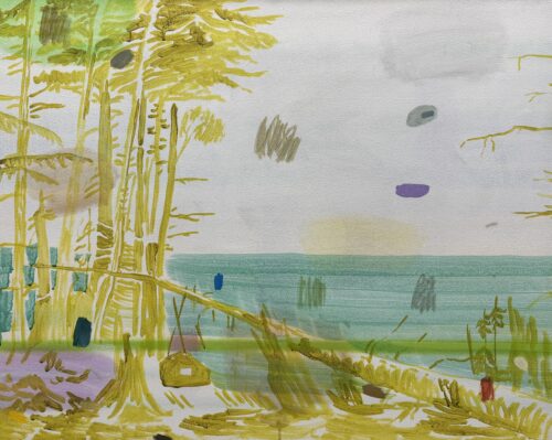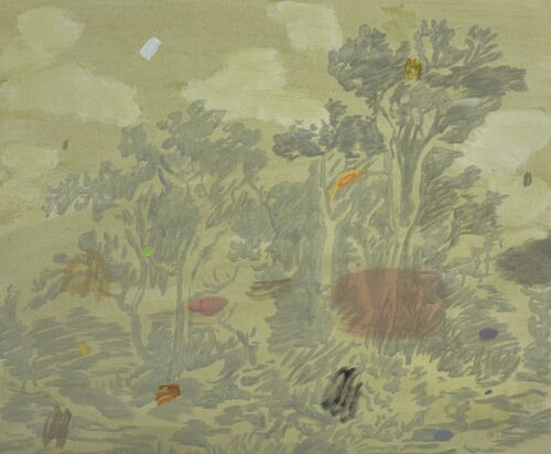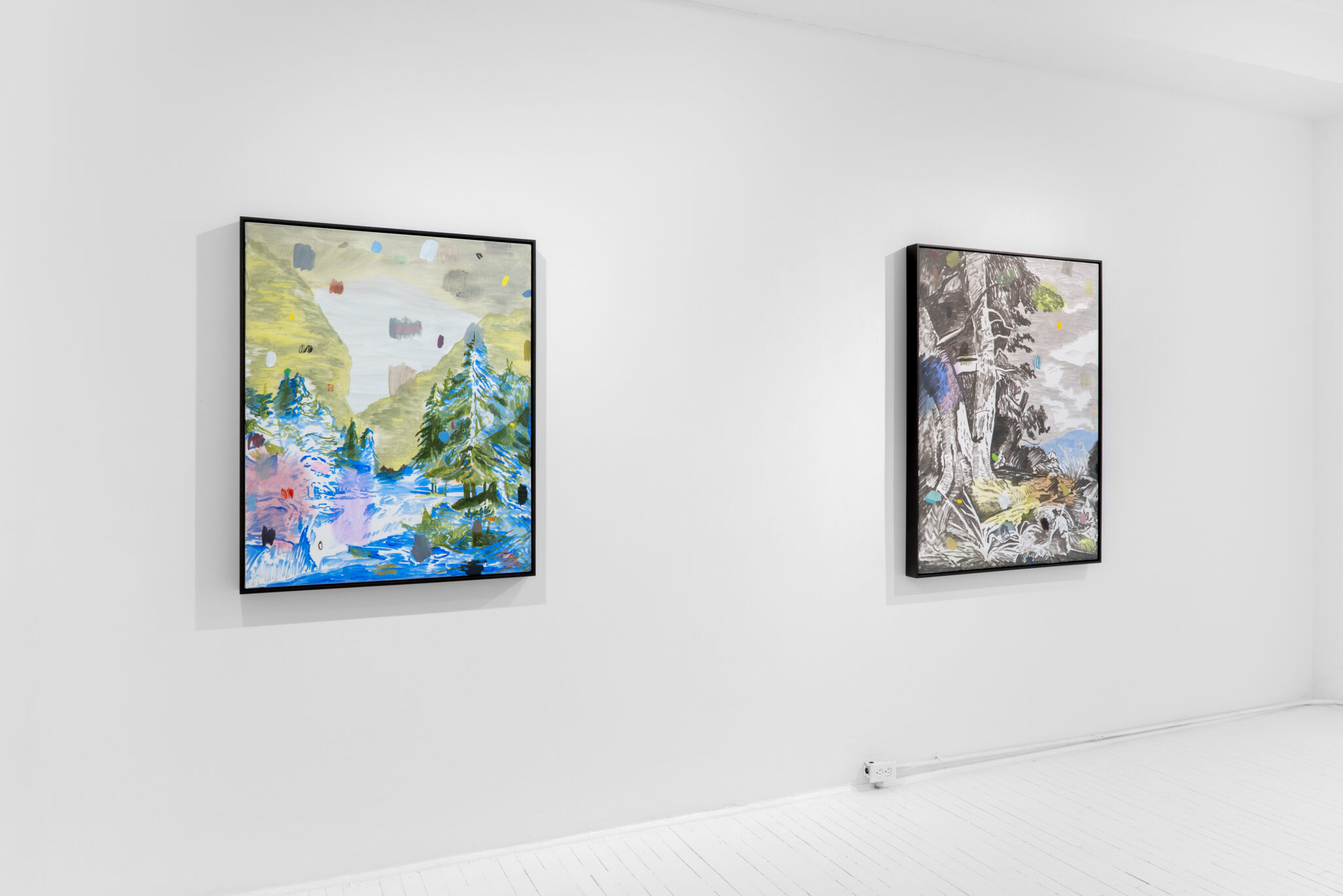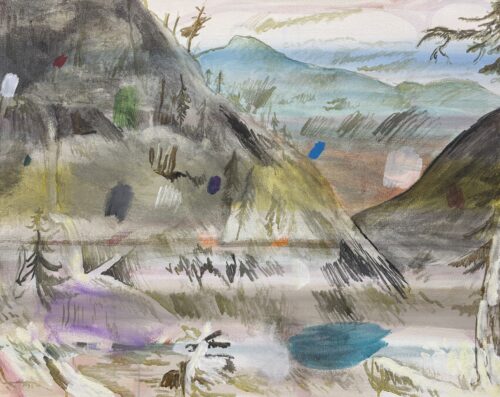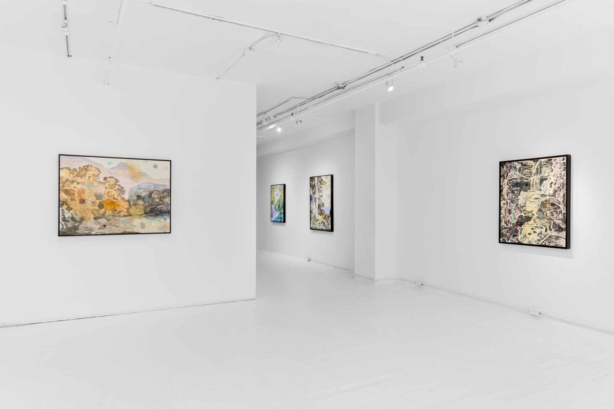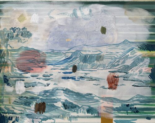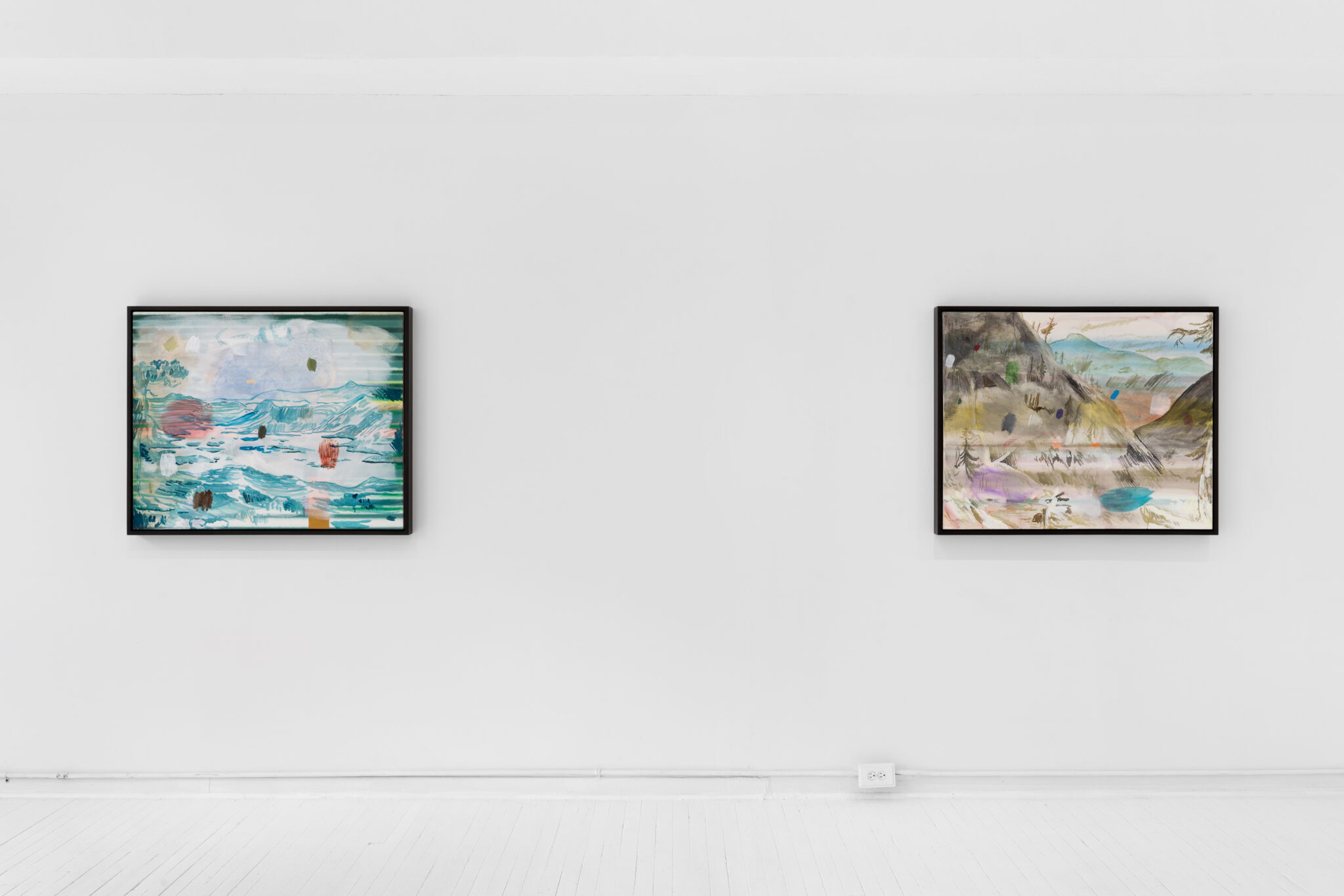 Dans cette nouvelle série, son travail sur l’archive et la survivance des images s’enrichit d’une dimension plus personnelle et introspective. À la manière d’un palimpseste, François Simard revisite ses propres œuvres, des abstractions réalisées dans les années 2000. Par un procédé de recouvrement, la peinture initiale transparaît en filigrane, affleurant de manière plus ou moins perceptible d’une toile à l’autre et révélant les continuités et les transformations qui traversent sa pratique. Les paysages de Bartlett entrent ainsi en résonance avec ses propres toiles de jeunesse, réactivées comme autant de reliques du passé.